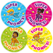 Great value for money Phonics Superhero reward stickers for children. These reward stickers are ideal for school teachers or teaching assistants who want to say a big “well done” to a child for good work in phonics. Measuring 30mm in diameter, these stickers feature 6 different Superhero variations and are printed on A5 gloss sticker paper. You will receive 144 30mm stickers with the text: "Super Phonics!"