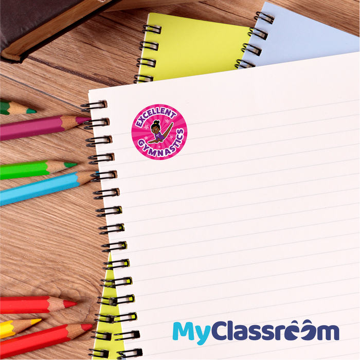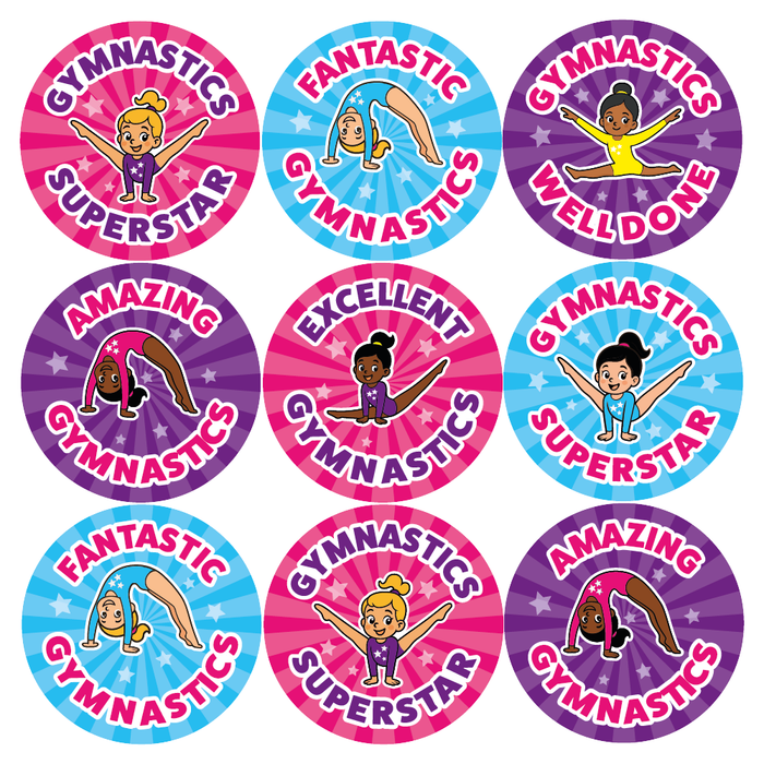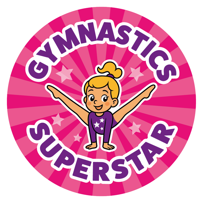 Great value for money gymnastics reward stickers for children. These reward stickers are ideal for Gymnastics class teachers or parents who want to reward a child for a good performance or effort in their gymnastics class. Measuring 30mm in diameter, these merit stickers feature 6 different variations and are printed on A5 gloss sticker paper. You will receive 144 30mm stickers with different text on each one